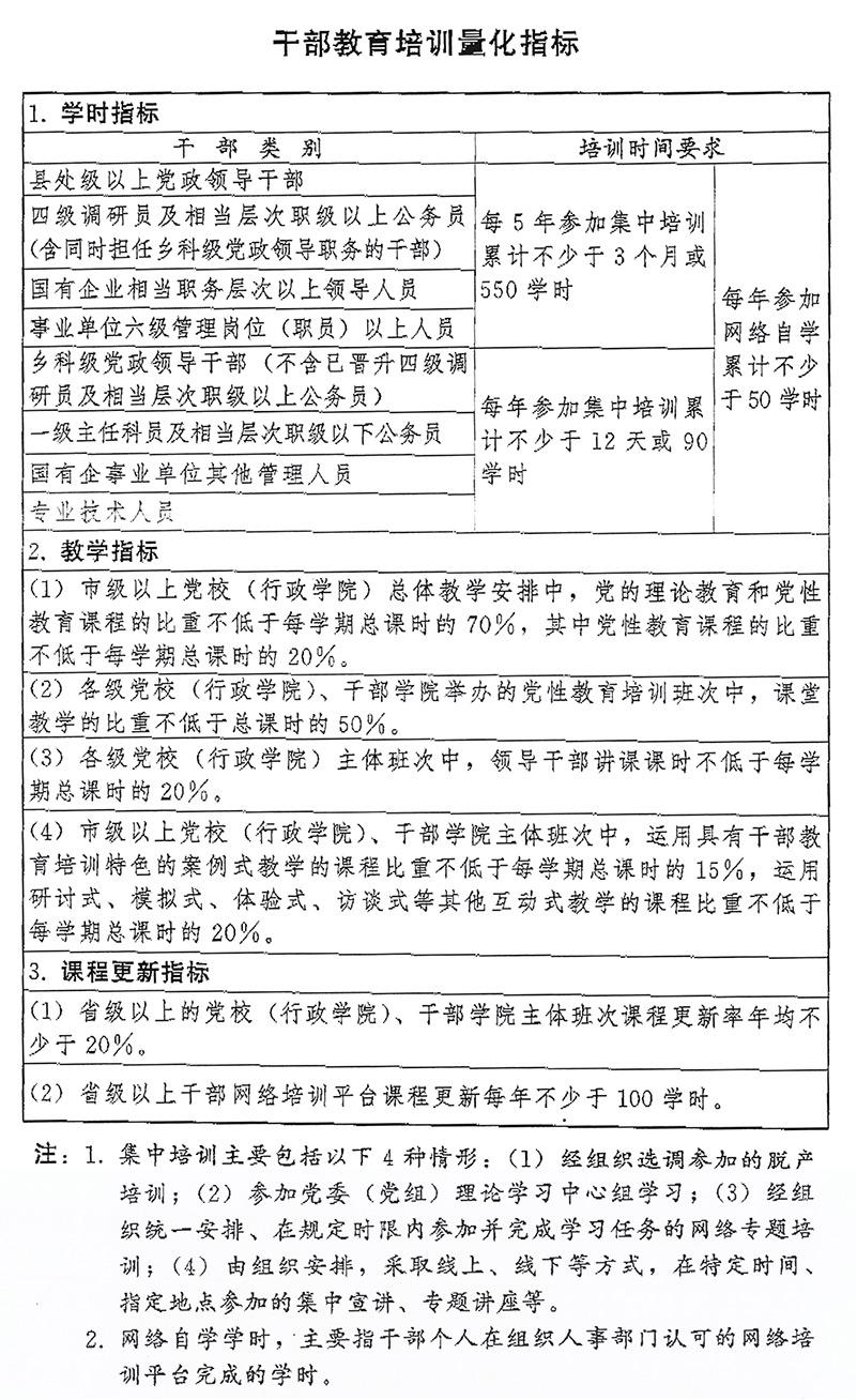 (一)培訓機構建設。推進各級黨校(行政學院)建設,以教學督導、師資培養、質量評估為重點,強化上級黨校(行政學院)對下級黨校(行政學院)的業務指導,不斷提高辦學水平。推進縣級黨校(行政學校)分類建設。加強社會主義學院建設。進一步提升部門行業培訓機構、國有企業培訓機構辦學質量。加強對干部教育培訓高校基地、基層干部教育培訓機構辦學指導。開展黨校(行政學院)、省(自治區、直轄市)黨性教育干部學院、干部教育培訓高校基地辦學質量評估。加強各類黨員干部教育培訓機構規范管理,嚴控新設以黨員干部為培訓對象的培訓機構。支持地方、部門聯合開展培訓,鼓勵干部教育培訓機構開展區域協作交流,推動優質培訓資源共享。實施干部教育培訓機構質量提升計劃(專欄5)。
