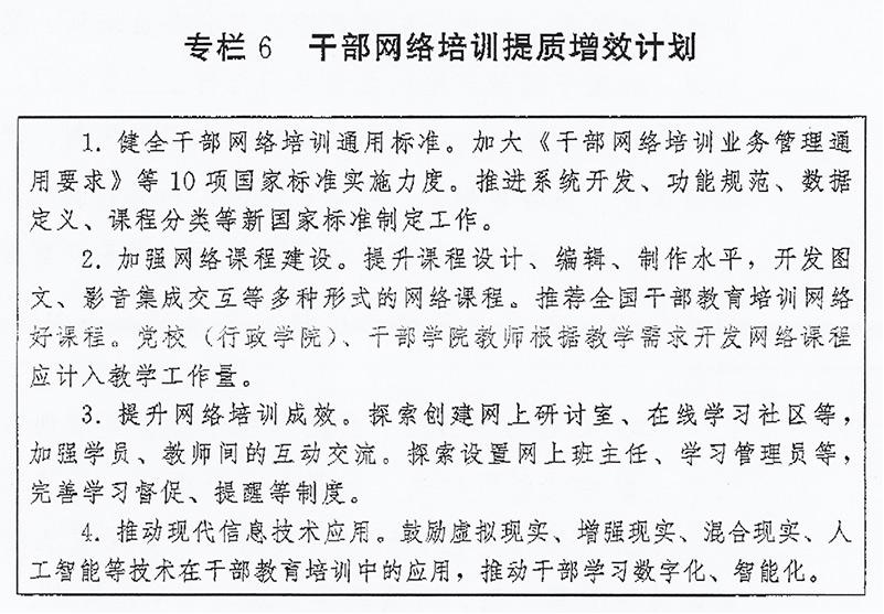 (二)加強網絡培訓課程建設。鼓勵黨校(行政學院)、干部學院和部門、企業、高校等組織開發精品網絡課程。注重把握網絡教學特點和規律,改進授課方式,提高制作水平,豐富呈現形式,提升課程質量。嚴把網絡課程政治關、質量關,規范講授、制作、審核、發布和更新、退出流程。充分發揮網絡培訓優勢,推動優質資源下基層。用好網絡直播培訓形式,增強現場體驗感。實施干部網絡培訓提質增效計劃(專欄6)。