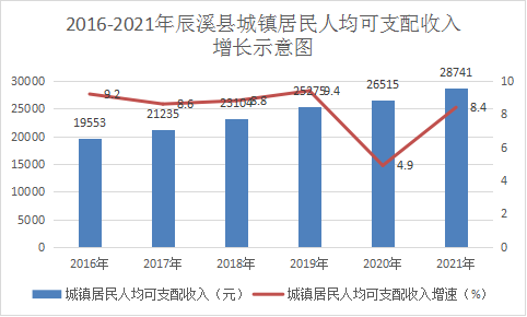 城鎮居民收入穩步增長。根據城鄉一體化住戶抽樣調查,全年全縣居民人均可支配收入18764元,比上年增長10.2%。其中,城鎮居民人均可支配收入28741元,增長8.4%,農村居民人均可支配收入13622元,增長11.7%。受疫情影響,城鎮居民收入反彈,城鄉收入差距縮小,農村居民人均可支配收入增長速度快于城鎮居民人均可支配收入增長速度3.3個百分點,城鄉居民人均可支配收入比2.11,比上年縮小0.06。全縣居民人均消費支出15831元,比上年增長10.3%,其中城鎮居民人均消費支出23594元,比上年增長6.3%,農村居民人均消費支出11833元,同比增長14.3%。
