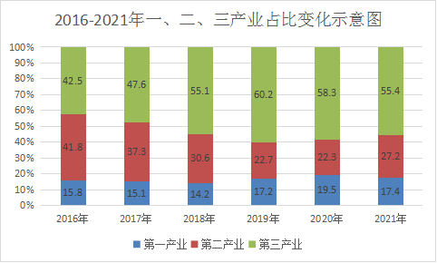 第二、三產業拉動作用繼續提升。三次產業占GDP比重由去年的19.49:22.26:58.25繼續優化為今年17.43:27.19:55.38。第二產業增加值占比較上年增加4.93個百分點,第三產業增加值占比依舊保持過半。三次產業對經濟增長的貢獻率分別為19.4%、36.0%和44.6%,分別拉動經濟增長1.7個、3.2個、4.0個百分點。第二產業增加值達36.67億元,增長12.9%,成為拉動GDP增長的主要動力,其中制造業增加值達25.03億元,增長19.9%,占GDP比重達18.6%。第三產業增加值達74.69億元,增長7.1%,凈增額達4.90億元,拉動GDP增長4.0個百分點,依舊是拉動社會經濟發展的基礎。