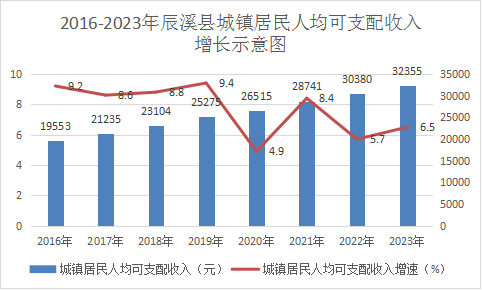 城鎮(zhèn)居民收入穩(wěn)步增長。根據(jù)城鄉(xiāng)一體化住戶抽樣調(diào)查,2023年全縣居民人均可支配收入21457元,比上年增長7.0%。其中,城鎮(zhèn)居民人均可支配收入32355元,增長6.5%,農(nóng)村居民人均可支配收入15728元,增長7.0%。城鄉(xiāng)居民收入穩(wěn)步增長,收入差距縮小,農(nóng)村居民人均可支配收入增長速度快于城鎮(zhèn)居民人均可支配收入增長速度0.5個百分點,城鄉(xiāng)居民人均可支配收入比2.057,比上年縮小0.01。全縣居民人均消費支出17481元,比上年增長5.7%,其中城鎮(zhèn)居民人均消費支出25346元,比上年增長4.3%,農(nóng)村居民人均消費支出13346元,同比增長6.6%。
