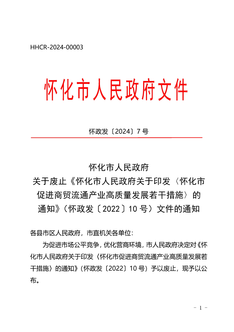 懷化市人民政府關于廢止《懷化市人民政府關于印發〈懷化市促進商貿流通產業高質量發展若干措施〉的通知》(懷政發〔2022〕10號)文件的通知