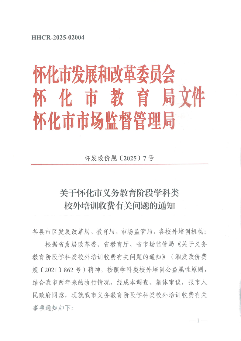 索引號:431200/2025-024584 文號:懷發改價規〔2025〕7號 統一登記號:HHCR-2025-02004