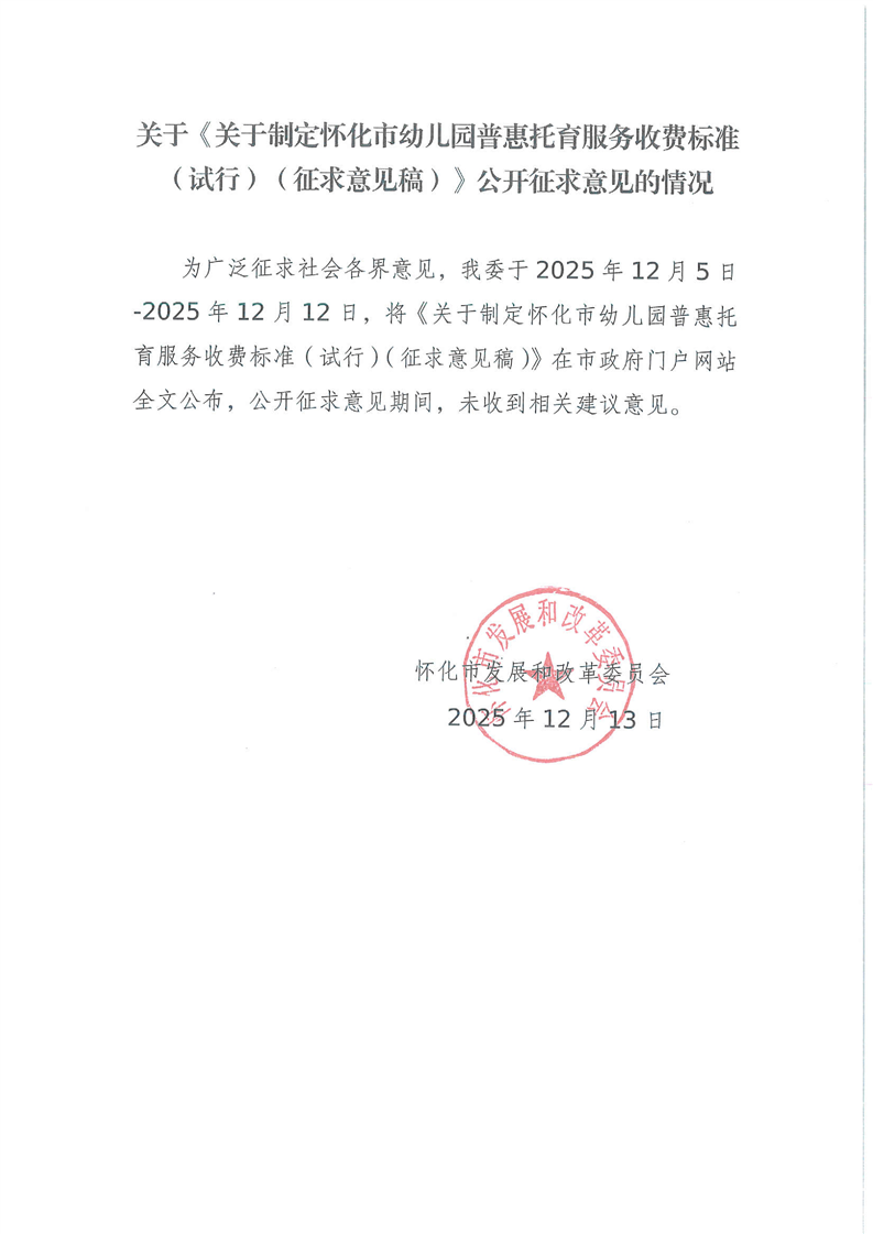 關于《關于制定懷化市幼兒園普惠托育服務收費標準(試行)(征求意見稿)》公開征求意見的情況