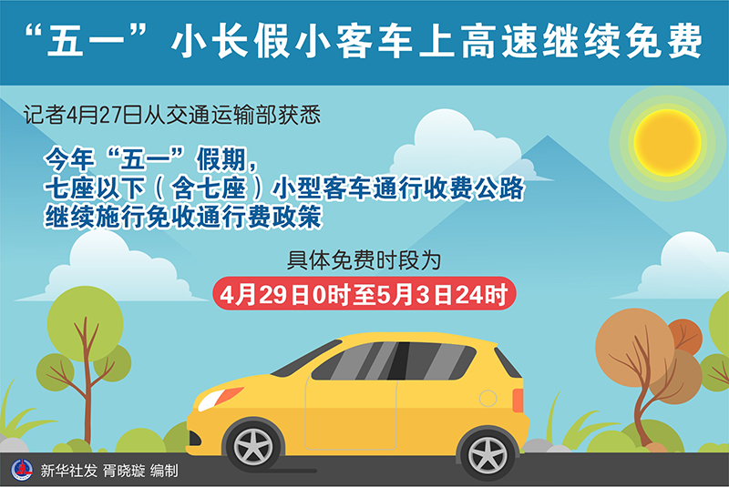 “五一”假期臨近。記者4月27日從交通運輸部獲悉,2023年“五一”假期,七座以下(含七座)小型客車通行收費公路繼續施行免收通行費政策,具體免費時段為4月29日0時至5月3日24時。