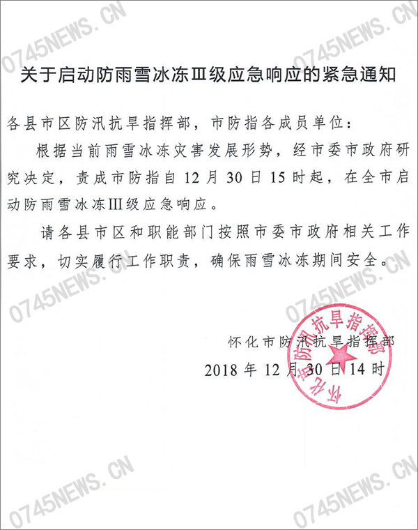 懷化市啟動防雨雪冰凍Ⅲ級應急響應