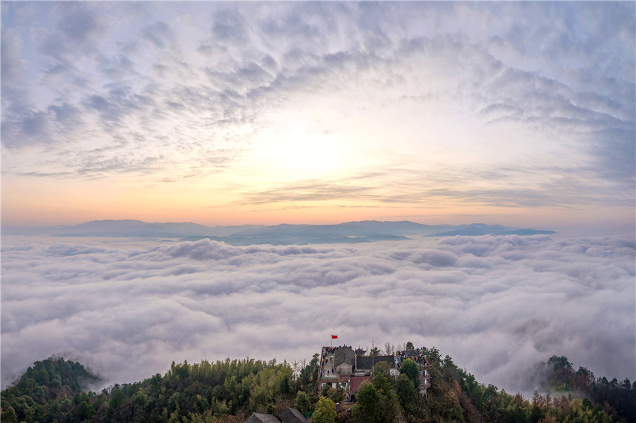 12月14日,航拍下的密巖尖云海格外壯麗。據了解,洪江區密巖尖是一處自然觀景勝地,僅需十幾分鐘的登山時間就可以俯瞰滔滔沅江及群山環繞的洪江古商城全貌。