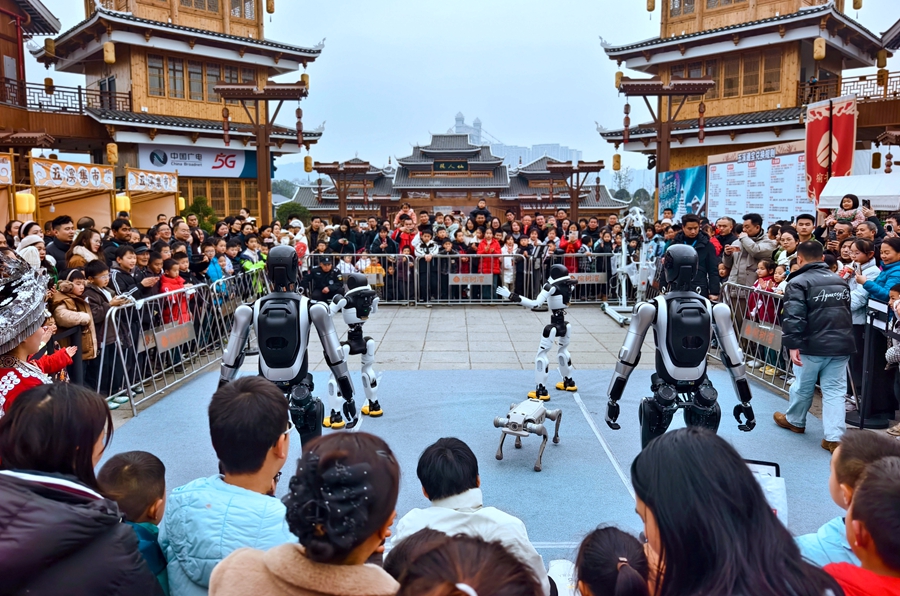 1月10日下午,智元機器人懷化展演活動亮相懷化榆樹灣青春廣場,勁舞、特技輪番上演,互動趣味十足,吸引了不少游客前來觀看。(懷化日報全媒體記者 潘雨 攝)
