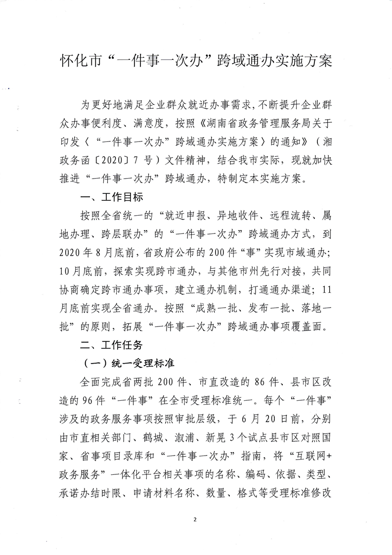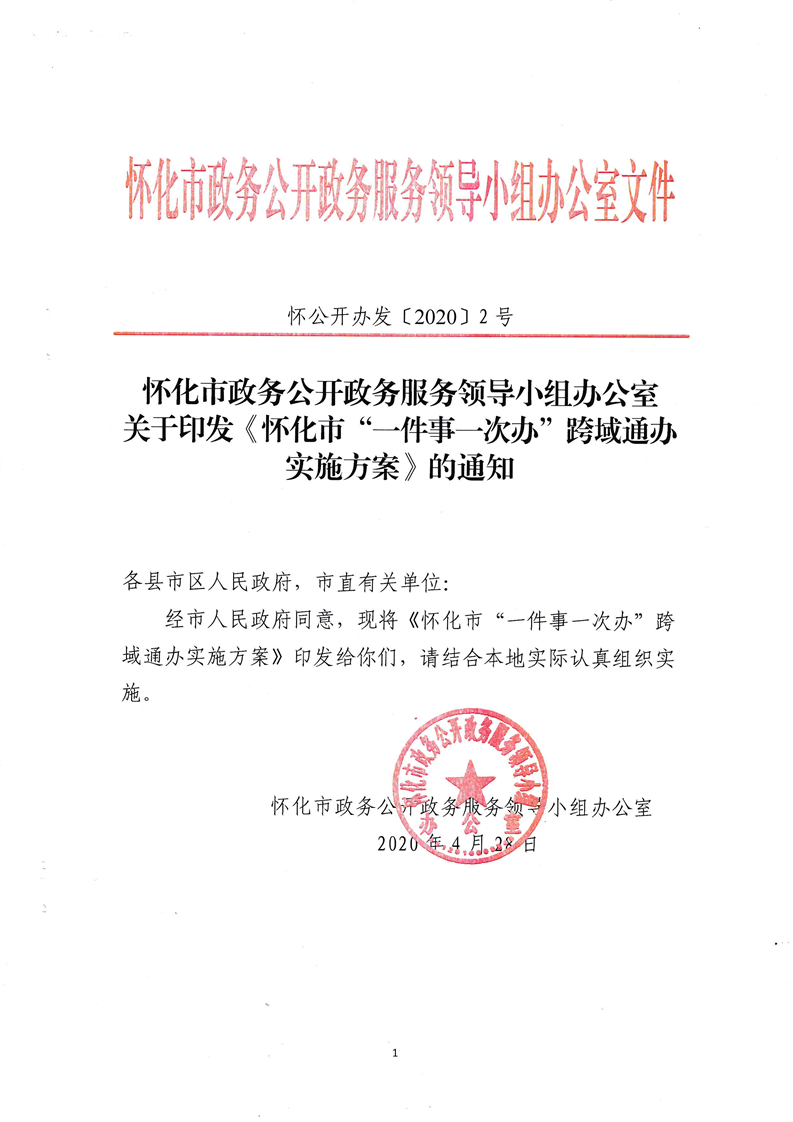懷化市政務公開政務服務領導小組辦公室關于印發《懷化市“一件事一次辦”跨域通辦實施方案》的通知