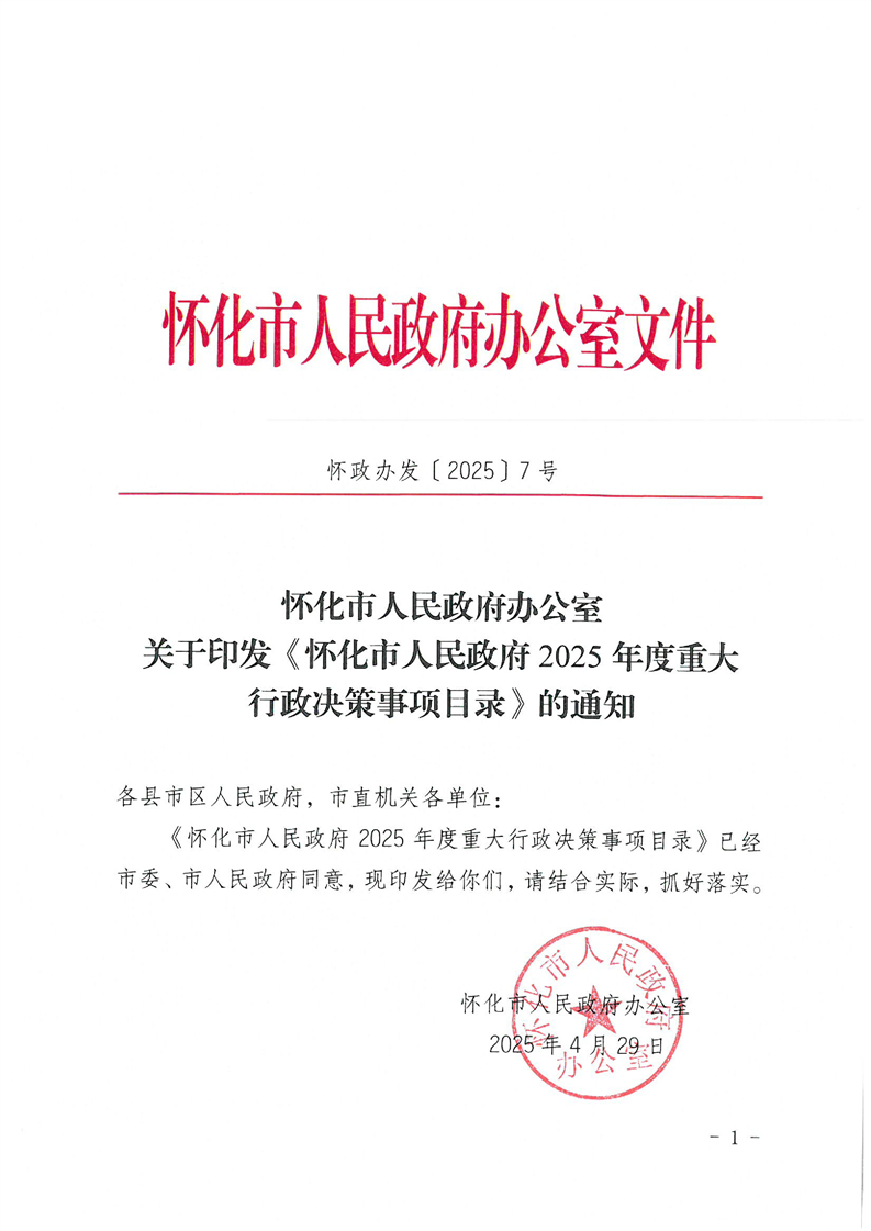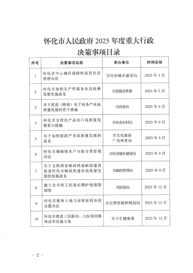懷化市人民政府辦公室關于印發《懷化市人民政府2025年度重大行政決策事項目錄》的通知