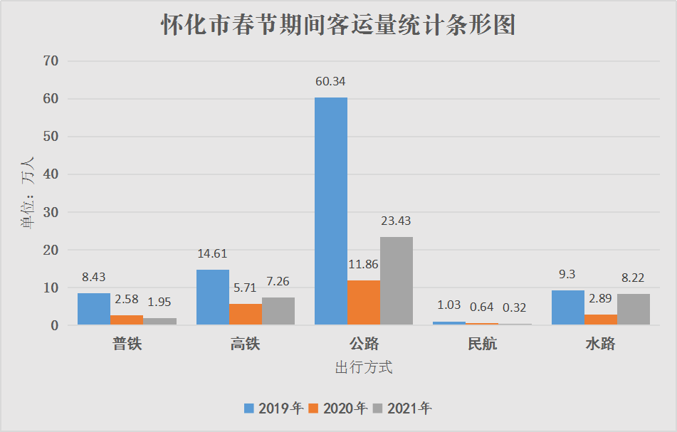 春節(jié)假期期間,懷化市綜合交通發(fā)送旅客41.18萬人,同比2020年上升74.02%,同比2019年下降61.1%。其中普鐵1.95萬人,同比2020年下降24.31%,同比2019年下降76.86%;高鐵7.26萬人,同比2020年上升27.22%,同比2019年下降50.32%;公路23.43萬人,同比2020年上升102.16%,同比2019年下降61.17%;水路8.22萬人,同比2020年上升184.92%,同比2019年下降11.62%;芷江機(jī)場(chǎng)3165人,同比2020年下降50.07%,同比2019年下降69.41%。受疫情影響,今年春節(jié)期間群眾出行旅游大幅減少,大部分市民選擇在懷就地過年,高速公路偶有堵塞現(xiàn)象,公路、水路客流量有所回暖,但未達(dá)到正常水平,部分普鐵線路停運(yùn),往年最熱鬧的高鐵客流量也有所減少。全市春運(yùn)總體平穩(wěn)、安全、有序。(市春運(yùn)辦 劉二華)