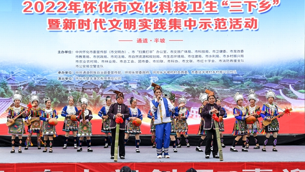 3月14日,通道坪坦鄉半坡村,文藝隊歌伴舞表演《歡迎你到侗鄉來》。當天,2022年懷化市文化科技衛生“三下鄉”暨新時代文明實踐集中示范活動啟動。(記者 楊智偉 攝)