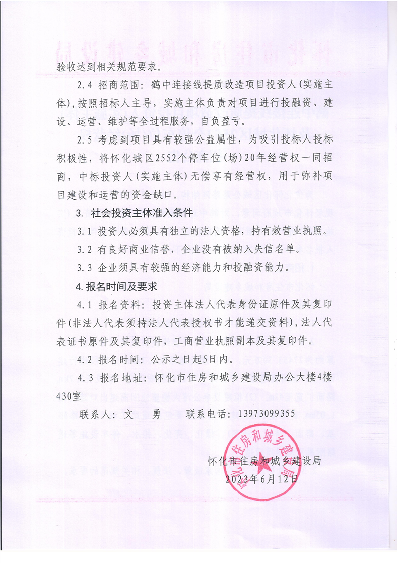 鶴中連接線提質(zhì)改造項(xiàng)目投資人(實(shí)施主體)及懷化城區(qū)2552個(gè)停車位(場(chǎng))經(jīng)營(yíng)權(quán)招商公告