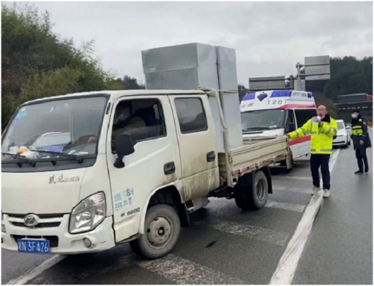 安江收費站副站長胡玨在收費廣場引導車輛,幫助載有重癥病人的救護車快速通過。