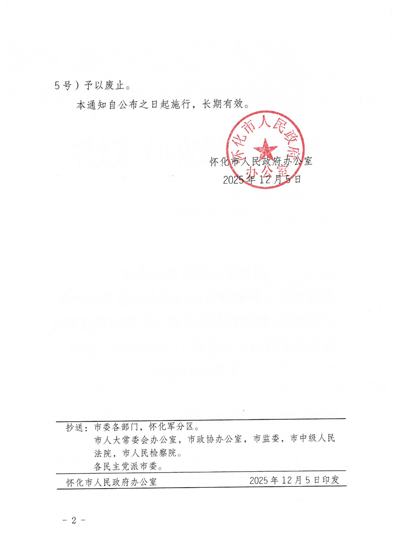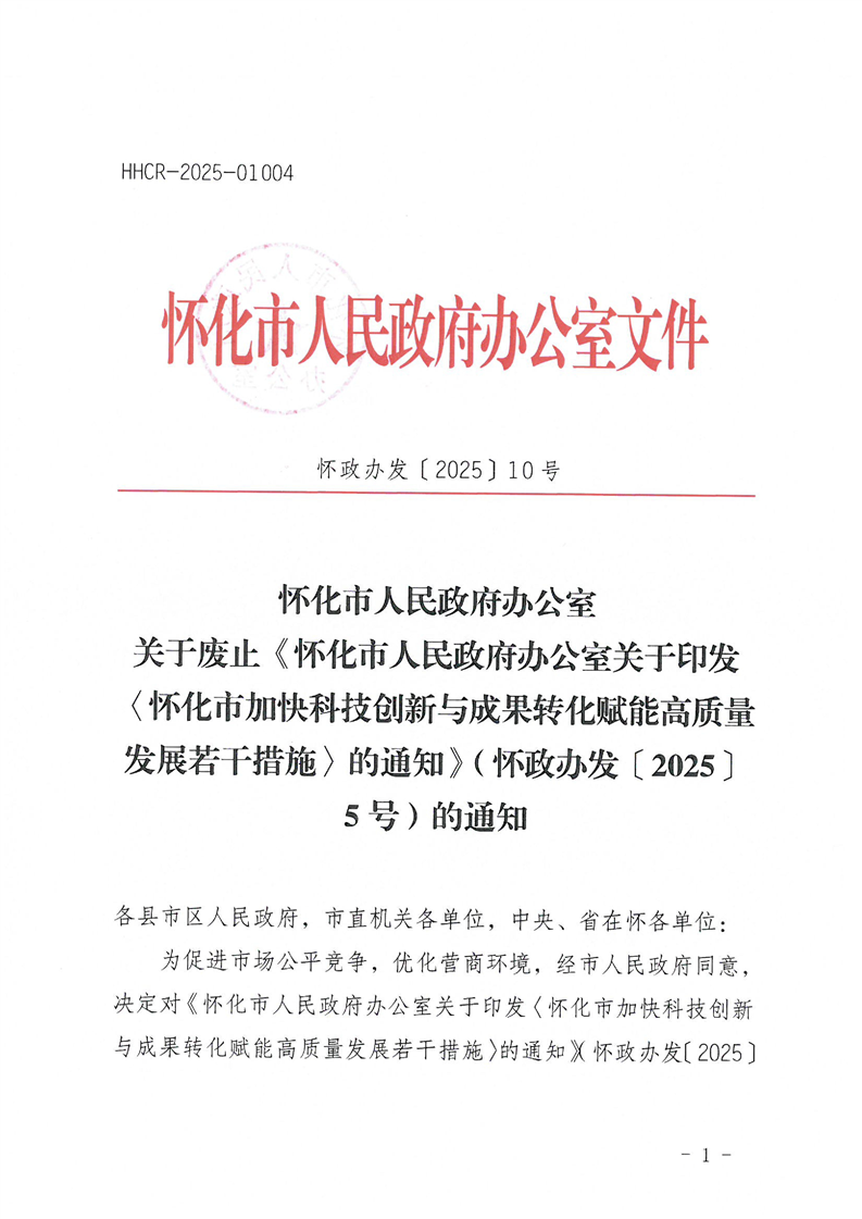 懷化市人民政府辦公室關于廢止《懷化市人民政府辦公室關于印發〈懷化市加快科技創新與成果轉化賦能高質量發展若干措施〉的通知》(懷政辦發〔2025〕5號)的通知