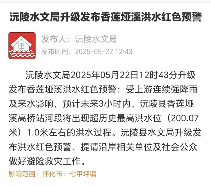 沅陵水文局升級發(fā)布香蓮埡洪水紅色預(yù)警